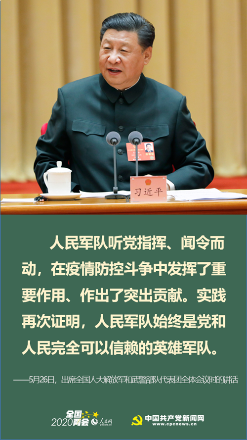 习近平指出,这场疫情防控斗争对我军是一次大考。人民军队听党指挥、闻令而动,在疫情防控斗争中发挥了重要作用、作出了突出贡献。实践再次证明,人民军队始终是党和人民完全可以信赖的英雄军队。